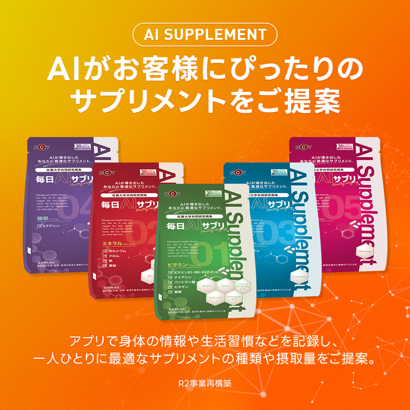 健康の為に補助食品やサプリメントを摂ろうと思っても、何をどれくらい買えばよいのか?・・ 調べたり、考えたりは大変です。 アプリを通して身体の情報(年齢・性別・身長・体重・・)や食生活、生活習慣、などを記録して頂くだけで、AIが健康に過ごす為に最適なサプリメントの種類や摂取量をご提案。 お客様は適切なサプリを無駄なく購入、摂取していただけます。